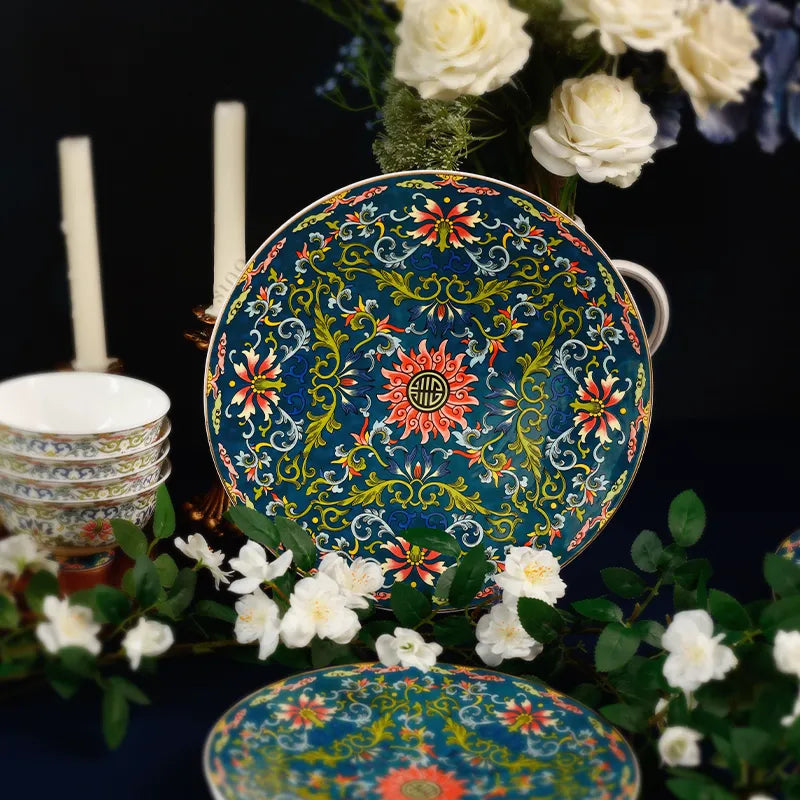 11’’ Chinoiserie Luxury Enamel Painting Bone China Round Dinner Plate on pure white background. 11’’ Chinoiserie Luxury Enamel Dinner Plate on blue tablecloth with white flowers (top view).