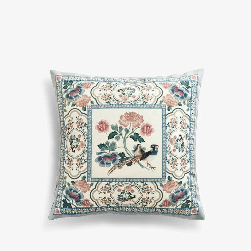 وسادة زخرفية باللون الوردي الفاتح بطبعات زهور وطيور أصلية من شركة Chinoiserie