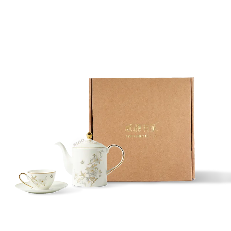 طقم قهوة صيني فاخر من 3 قطع - إبريق قهوة، كوب وصحن - تصميم زهرة الفاوانيا والفراشة