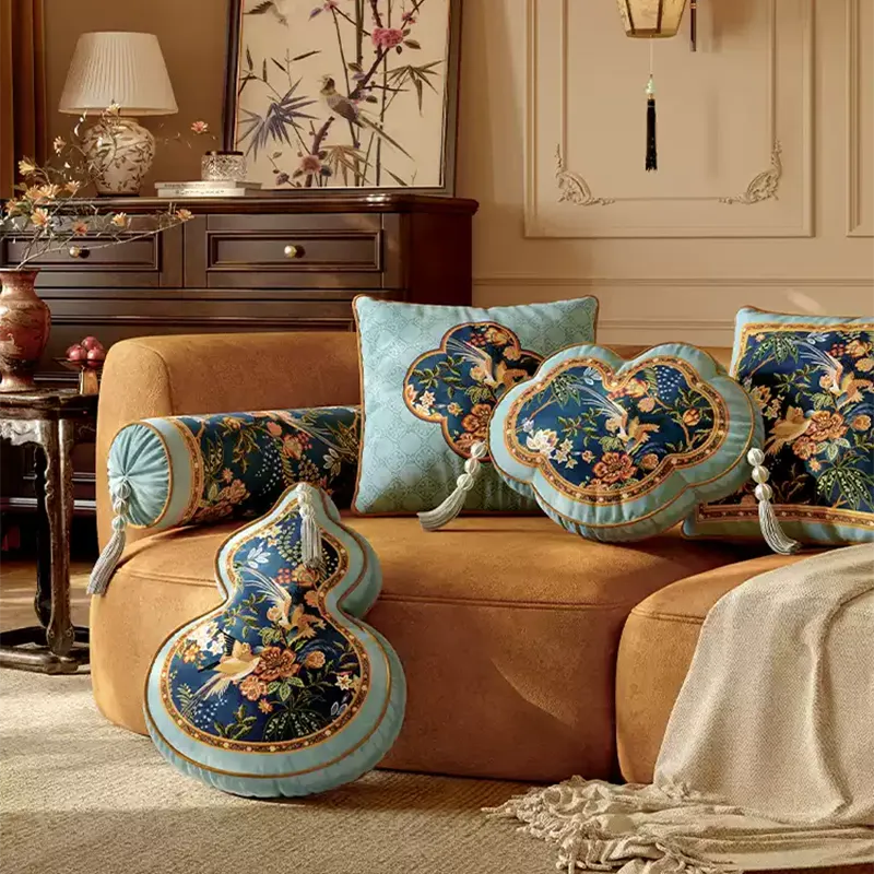 وسادة مطرزة بنقشة الفاوانيا والطاووس لتزيين أريكة السرير