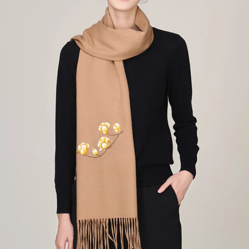 Handmade Suzhou Embroidery Wool Cashmere Scarf With Magnolia Flower 200 x 38 cm