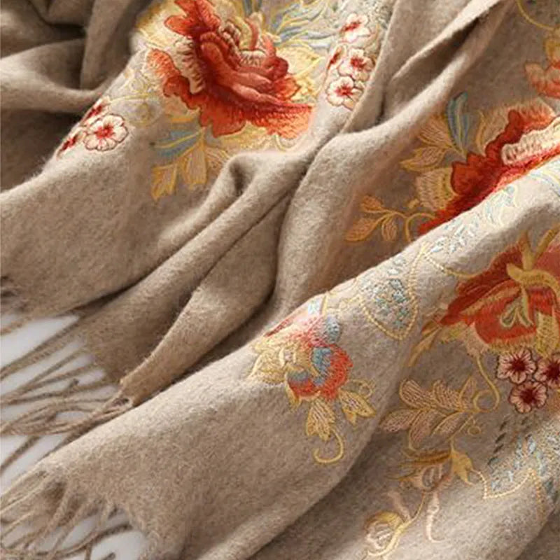 Embroidery Premium 100% Wool Cashmere Scarf Prosperous Peony Pattern 200 x 60 cm