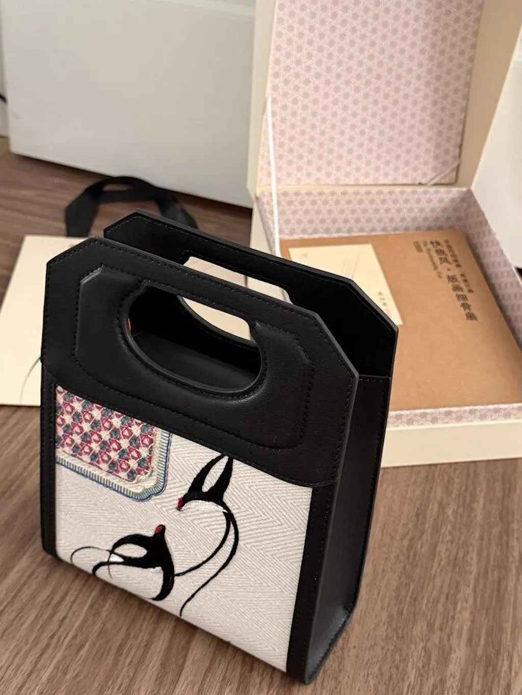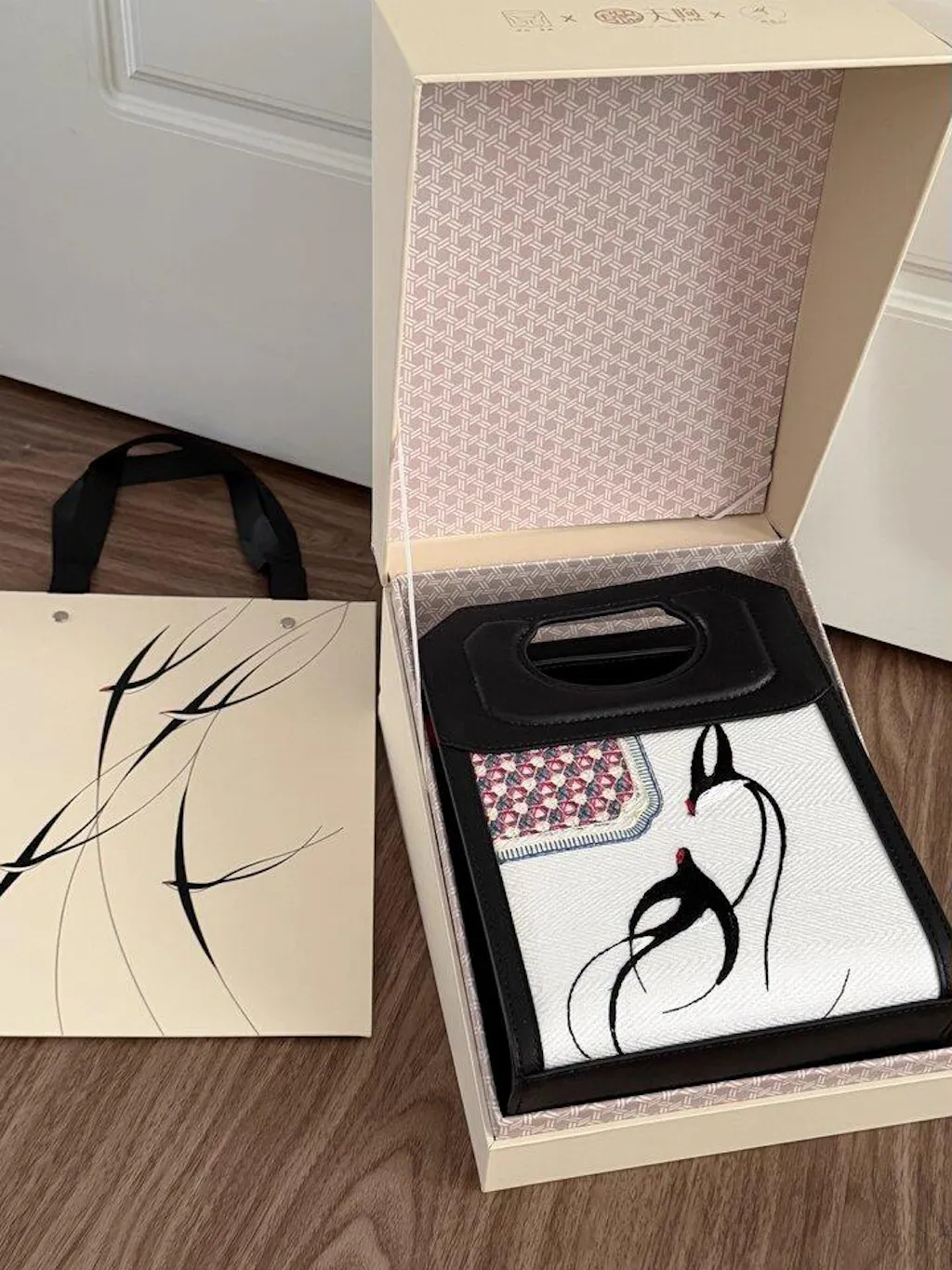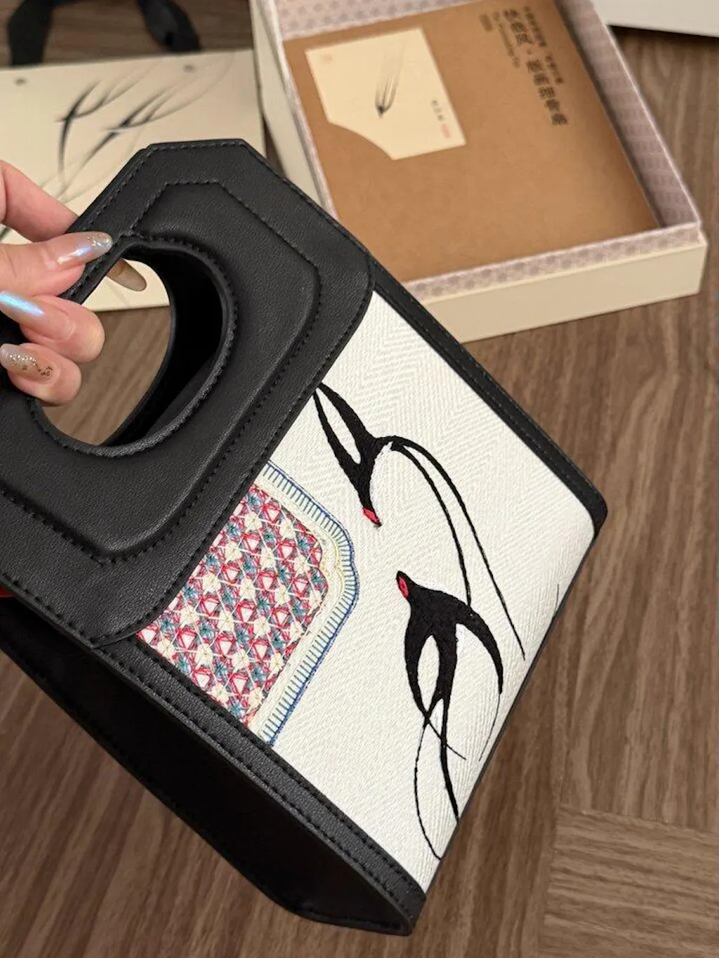 حقيبة يد جلدية فاخرة مطرزة على الطراز الصيني بنقشة طيور السنونو الربيعية