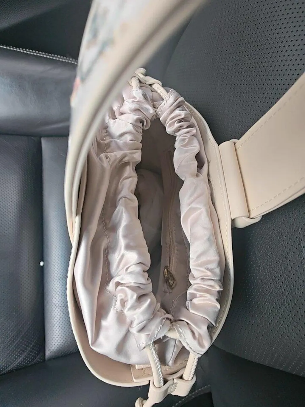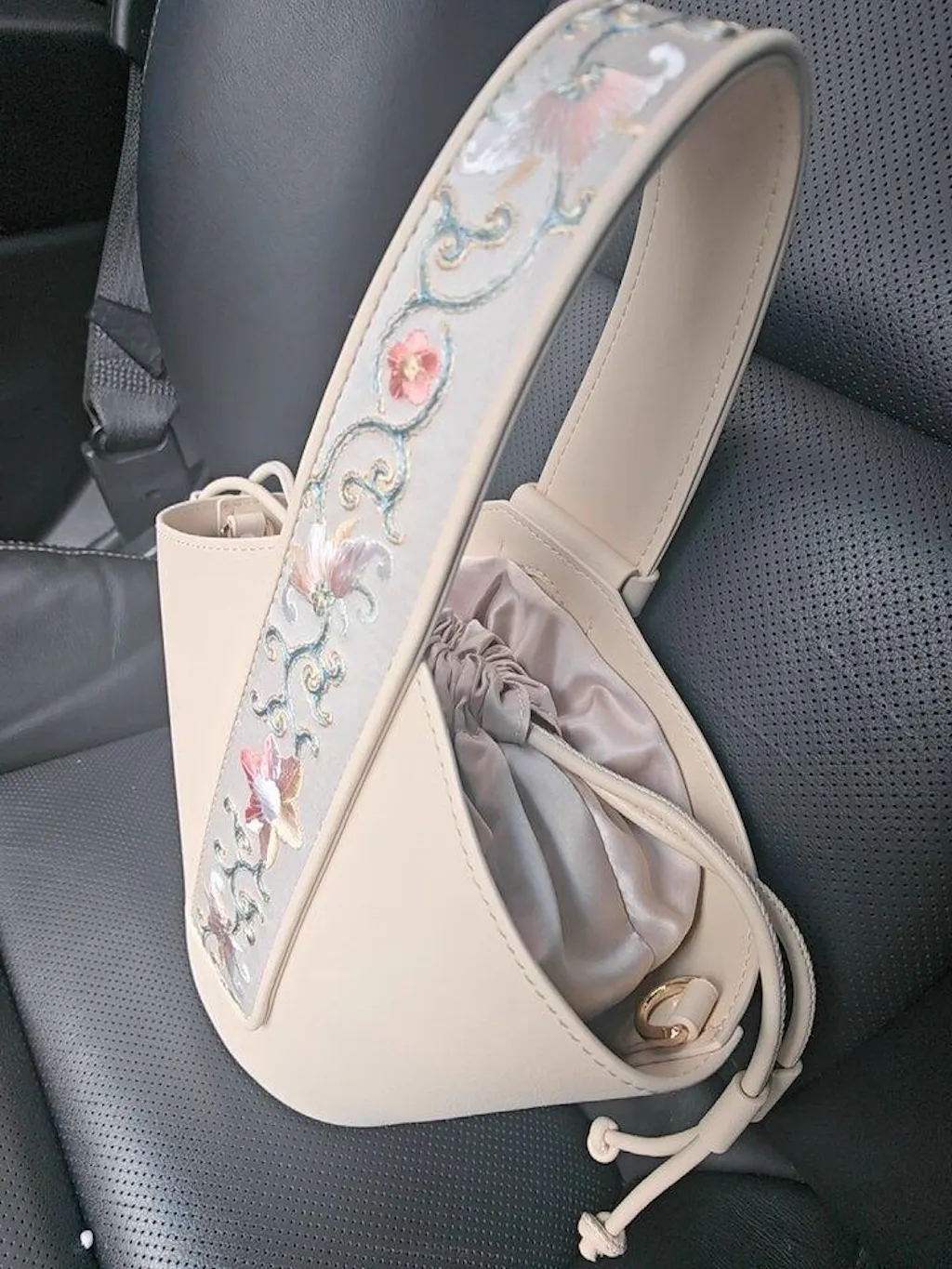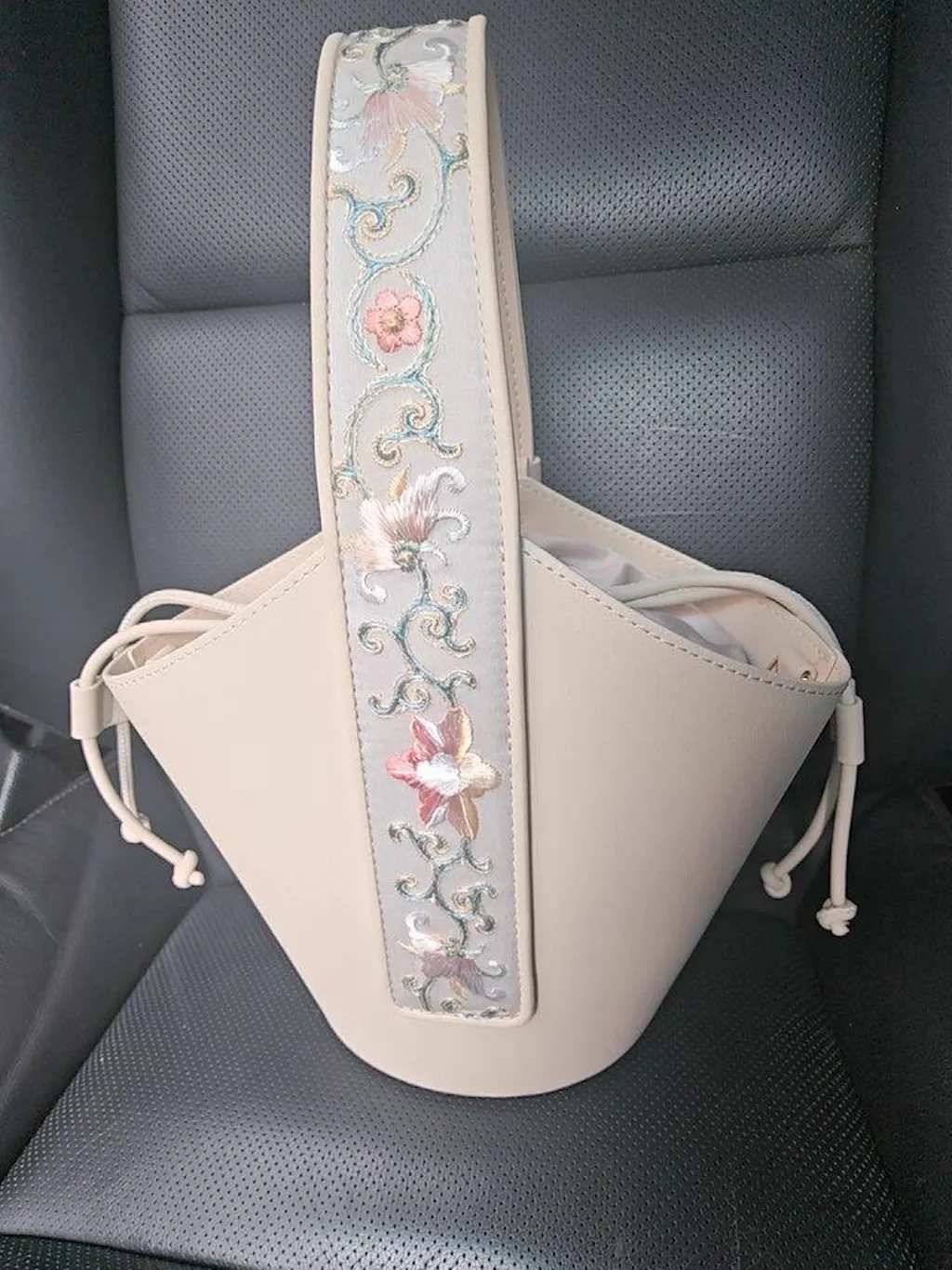 Chinoiserie Luxury Embroidery Lotus Scroll Pattern Drawstring Bucket Bag