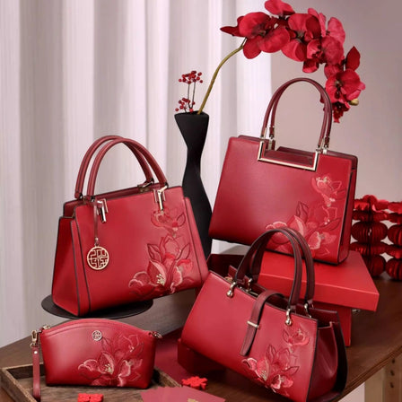 Sinocultural Embroidery Leather Red Tote Bag Magnolia Women's Handbag