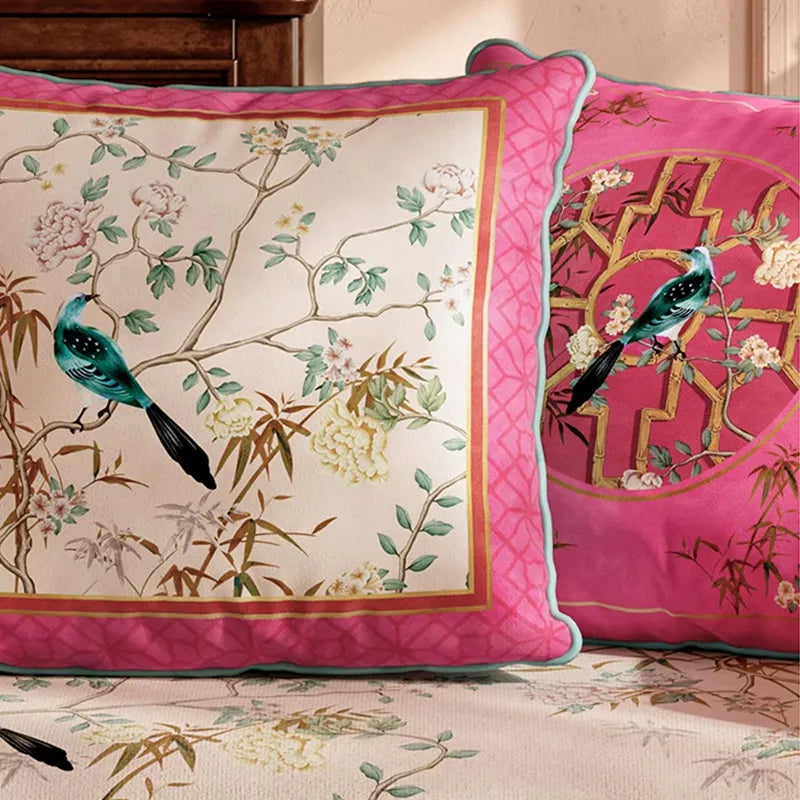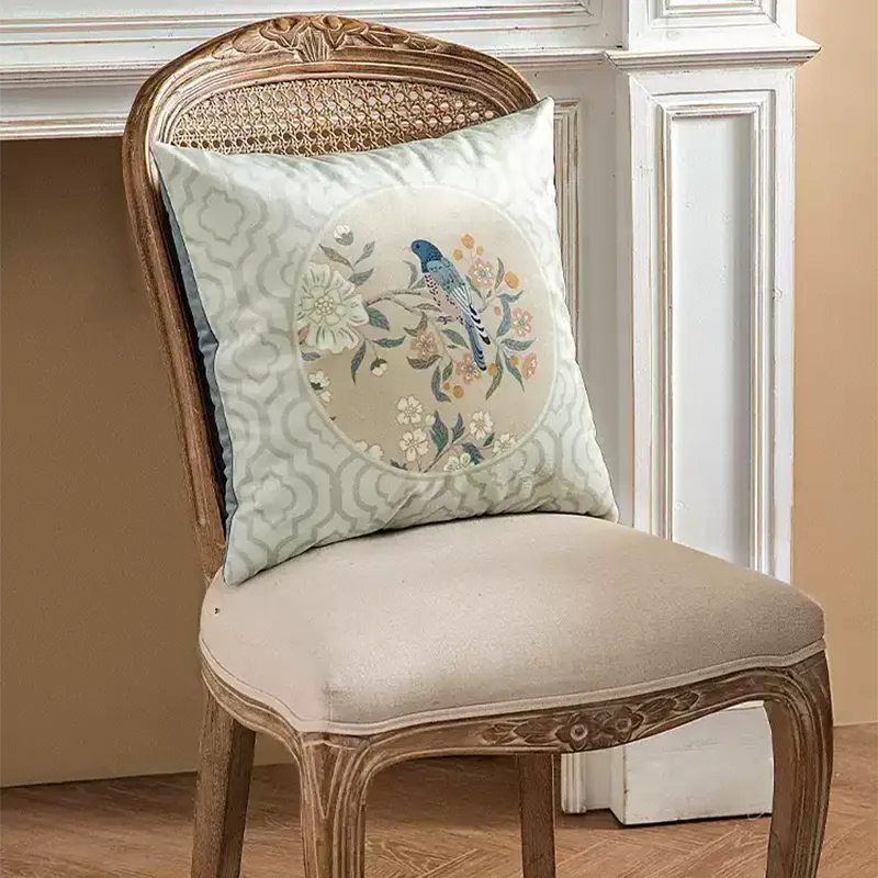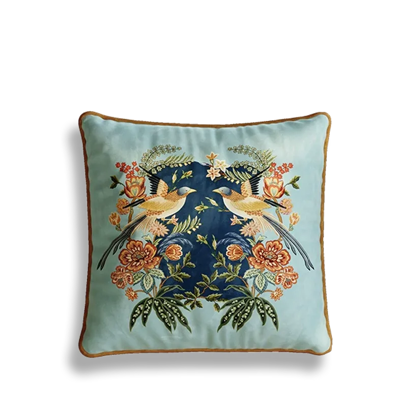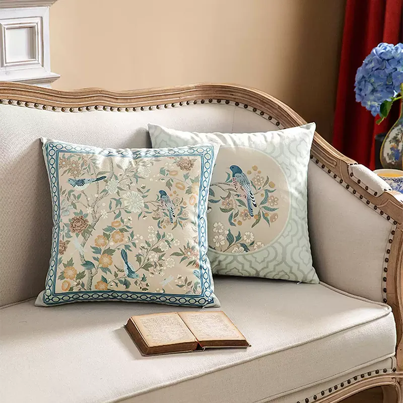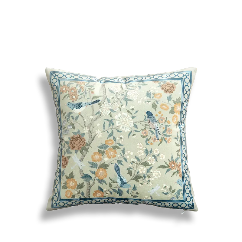 Chinoiserie Watercolor Birds & Blossoms Embroidered Pillow for Sofa & Bed Decor