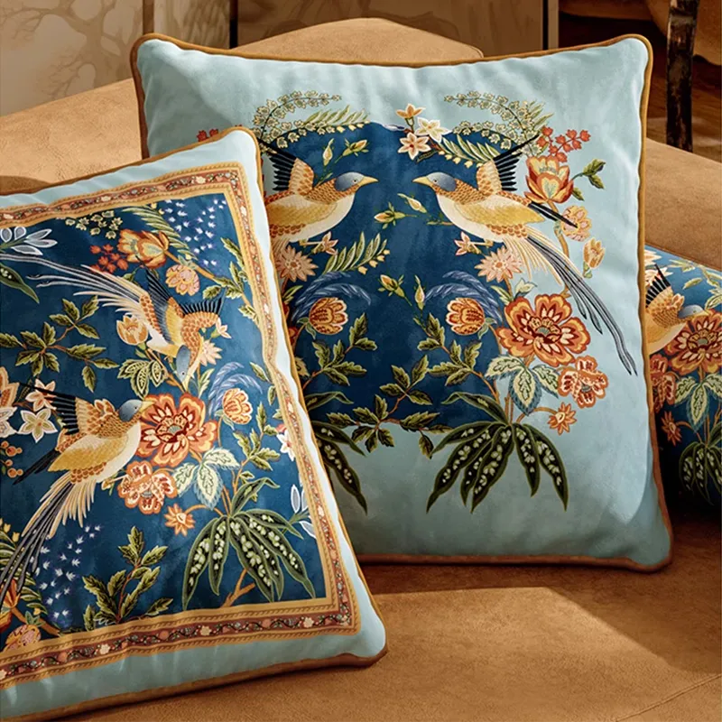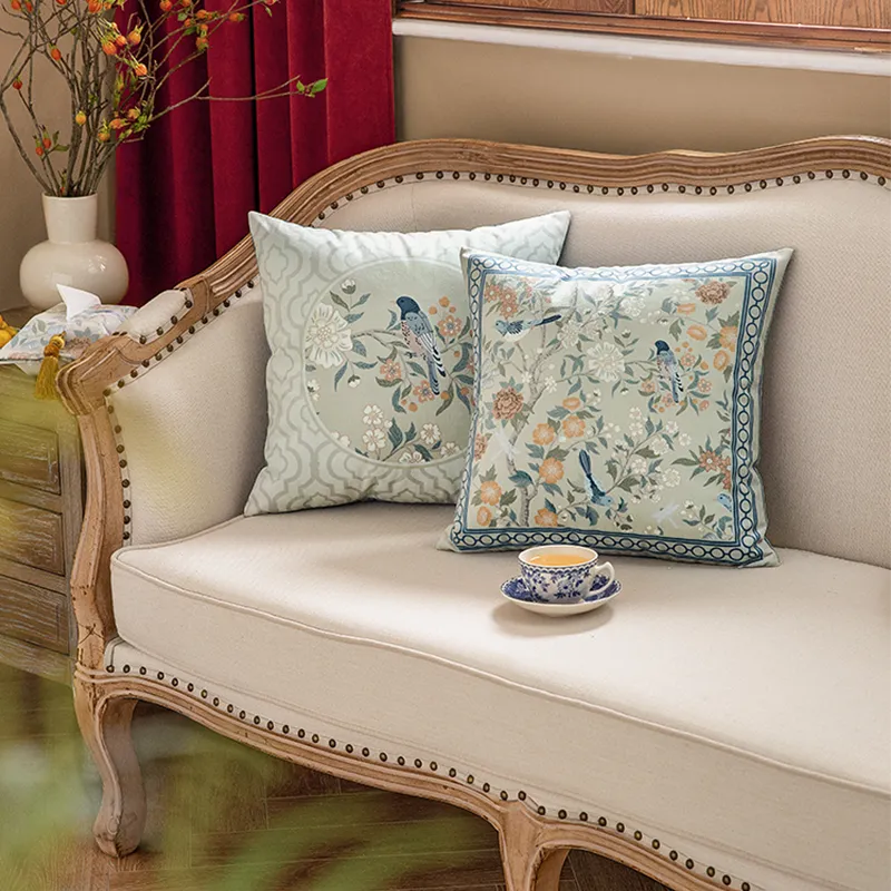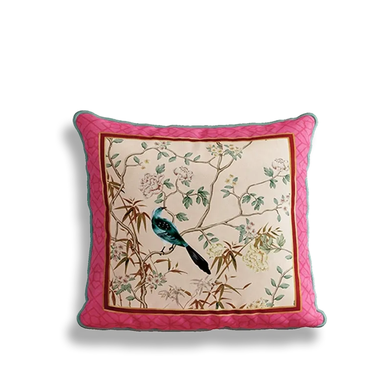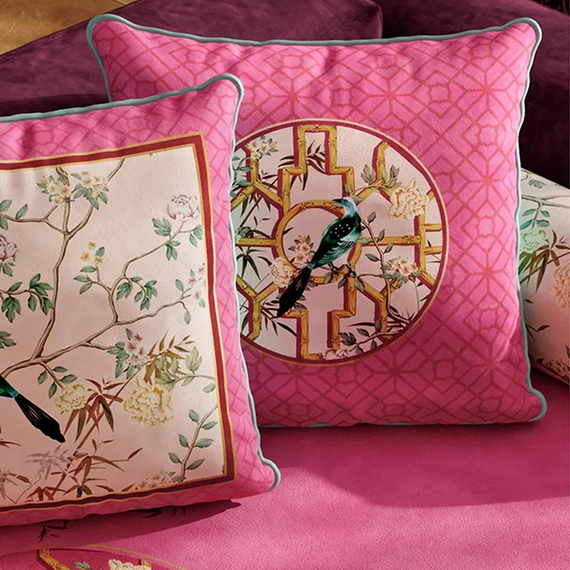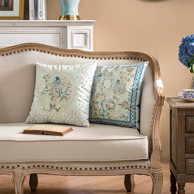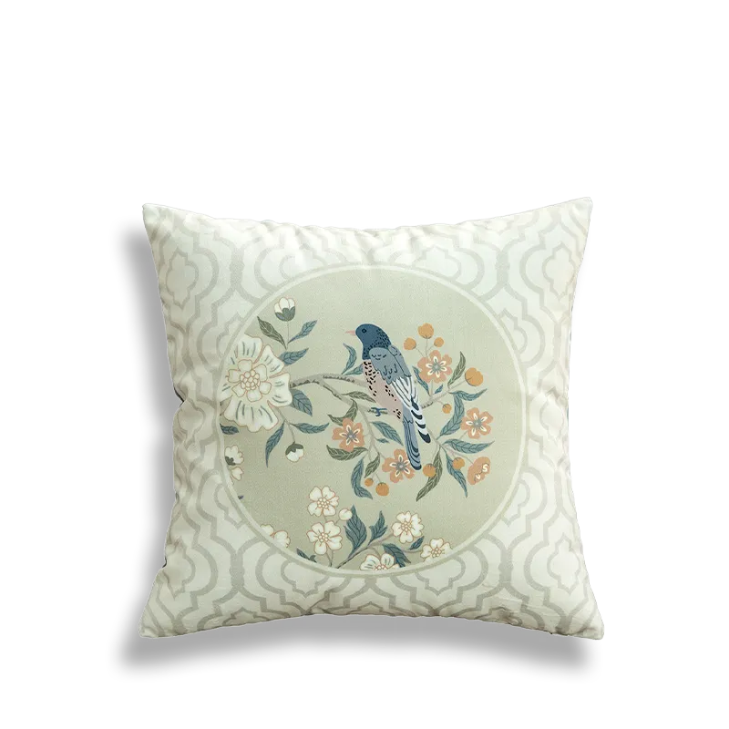 Chinoiserie Watercolor Birds & Blossoms Embroidered Pillow for Sofa & Bed Decor