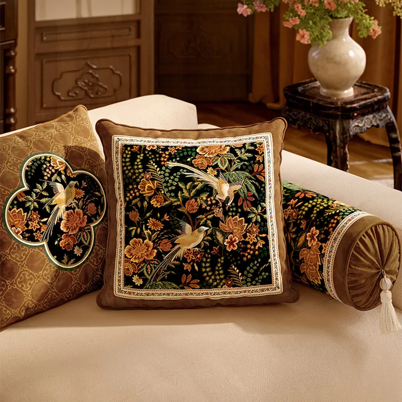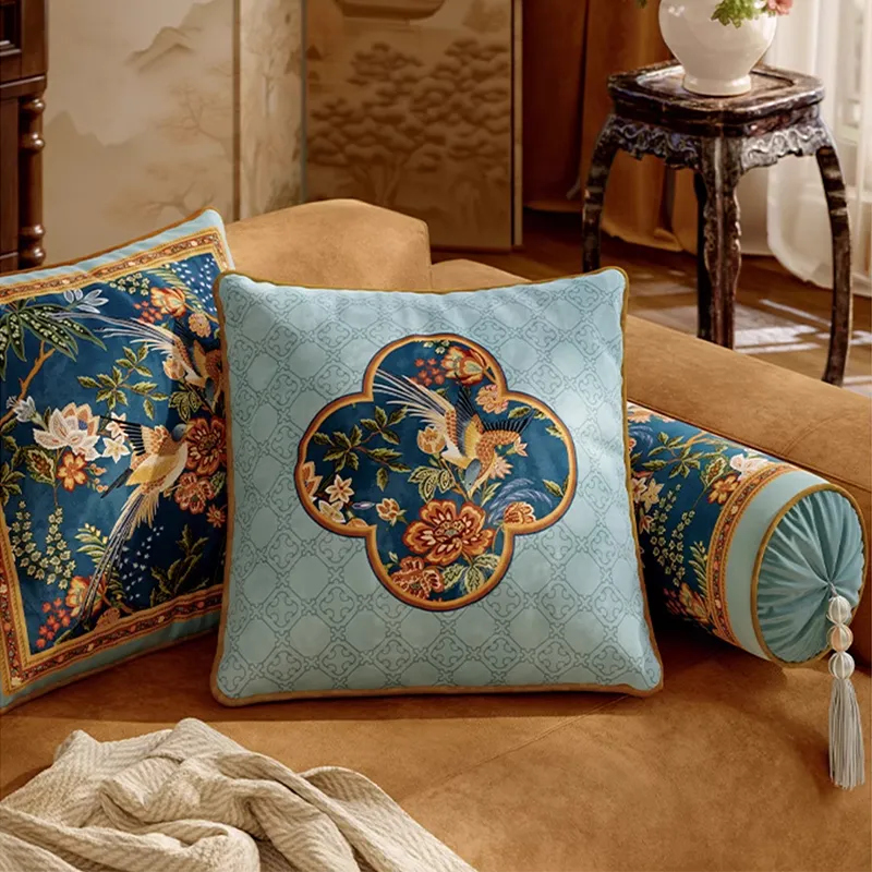 Chinoiserie Peony and Peacock Embroidered Throw Pillow for Sofa Bed Decor
