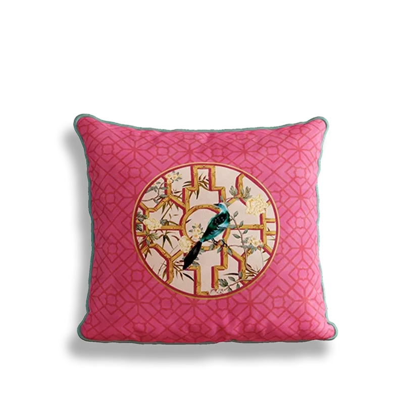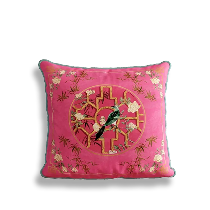 Chinoiserie Window Lattice Birds & Blossoms Embroidered Throw Pillow for Sofa & Bed Decor