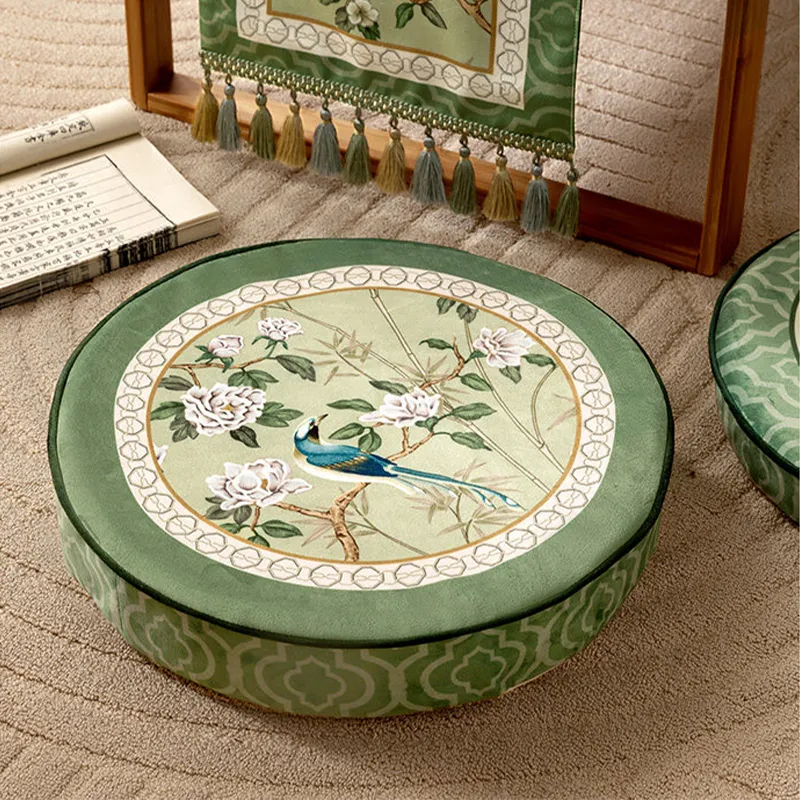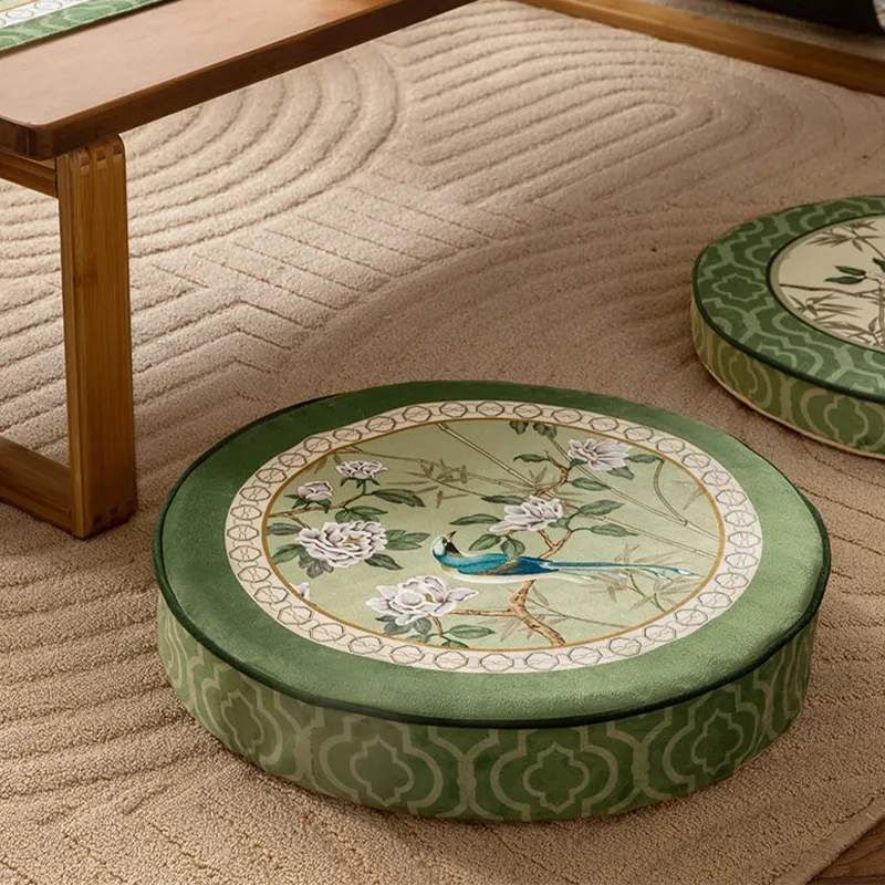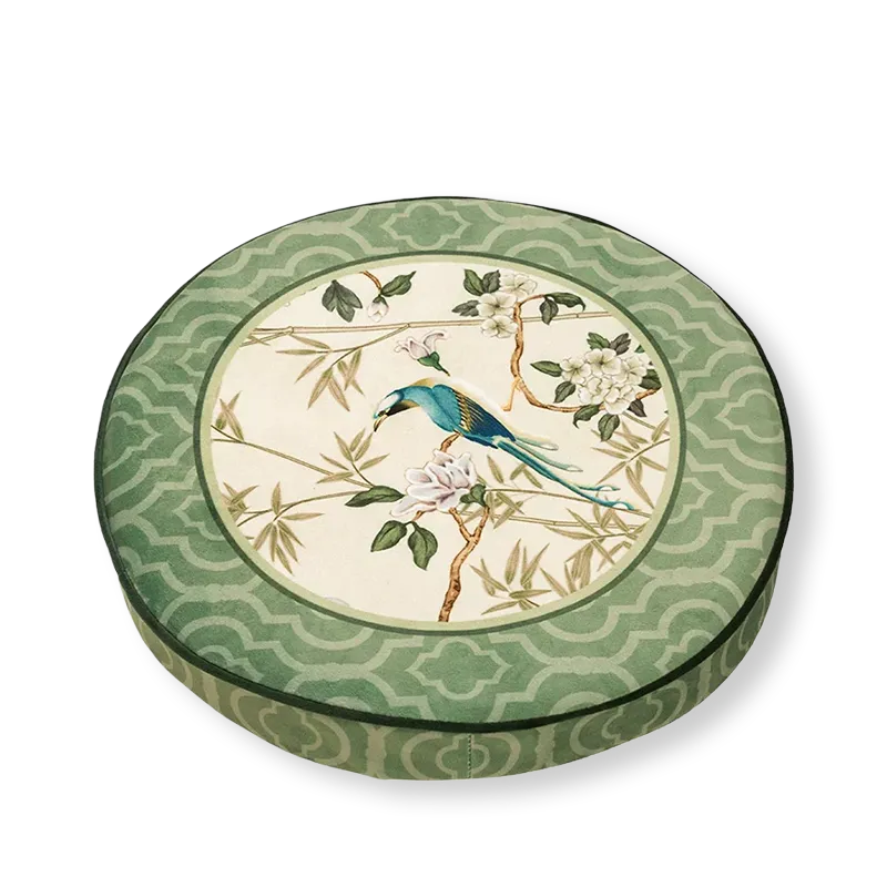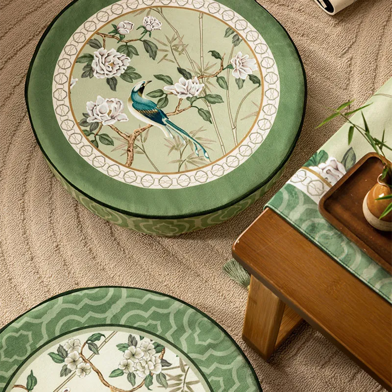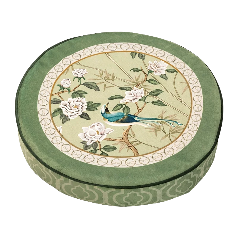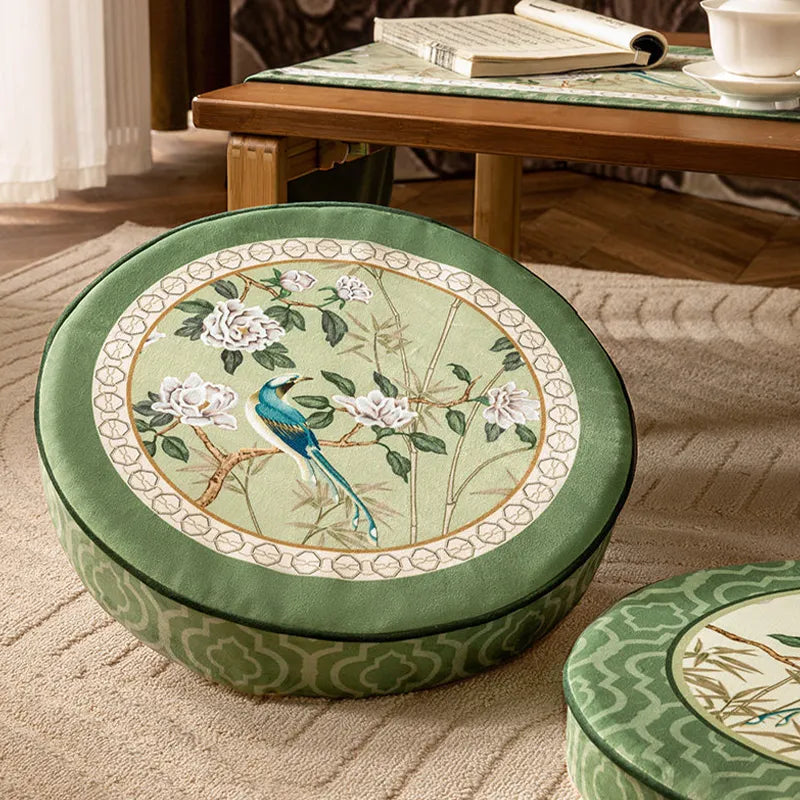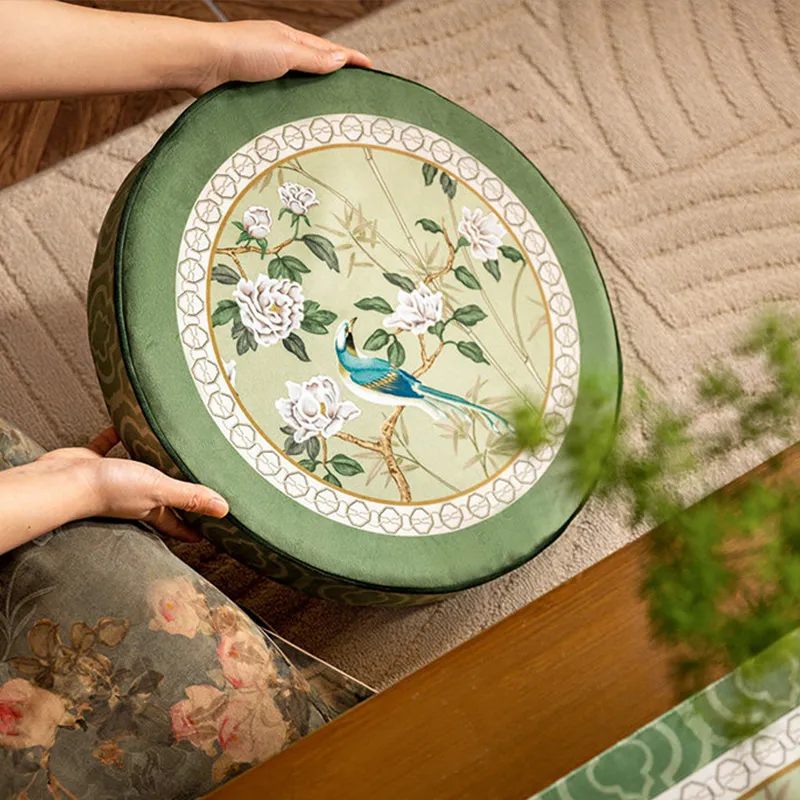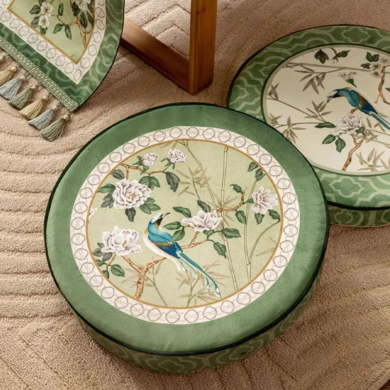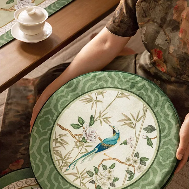 Coussin de chaise court en peluche verte à motifs chinois et fleurs et oiseaux