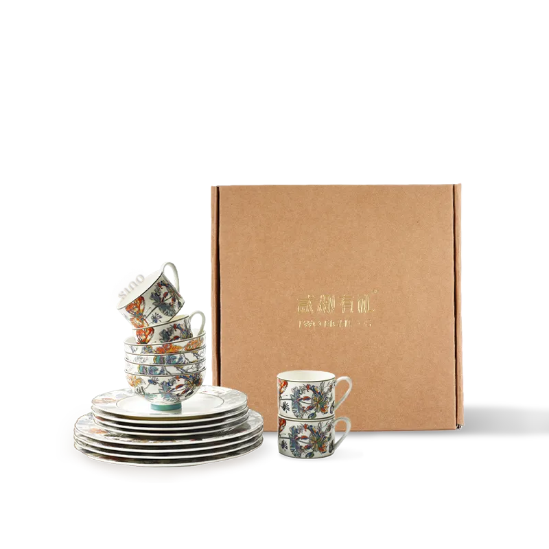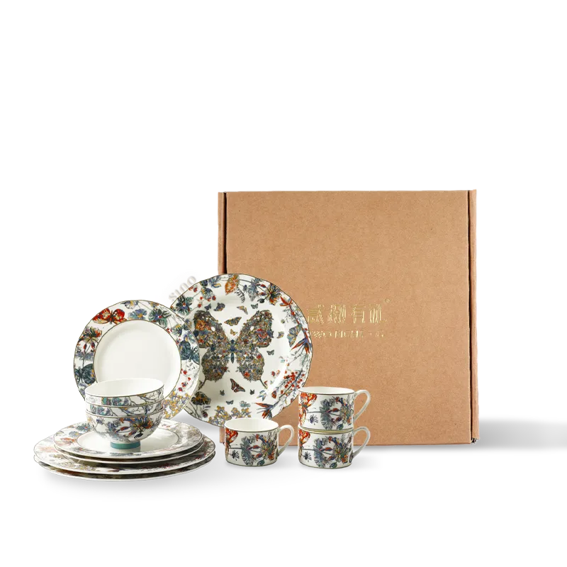 12 Pieces Luxury Chinoiserie Bone China Dinnerware Set – Butterfly & Floral Motif