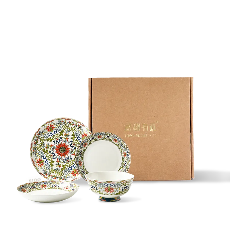 4 Pieces Chinoiserie Luxury Enamel Painting Bone China Casual Dinnerware Set