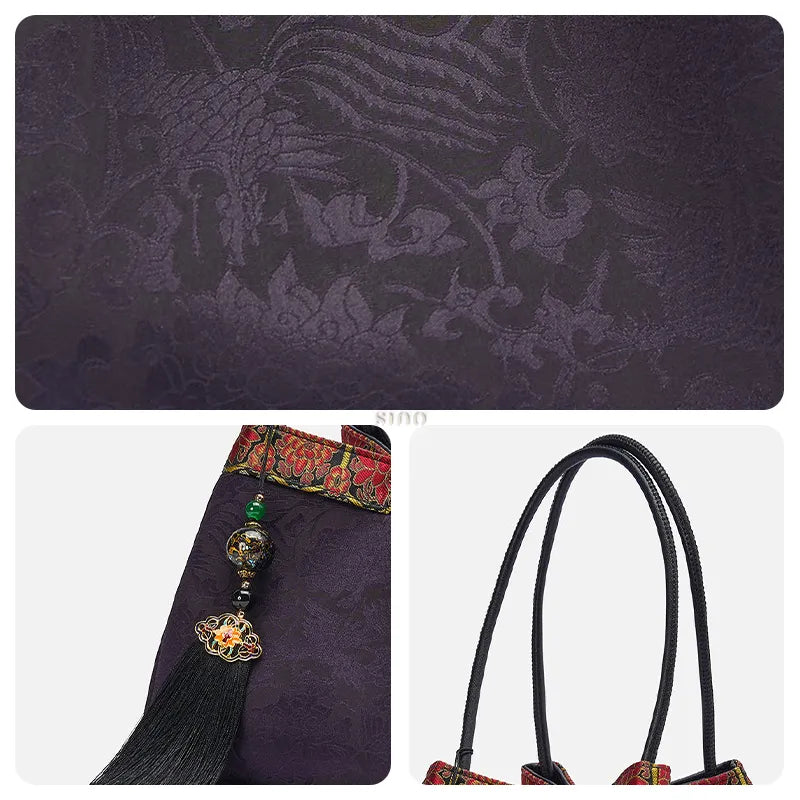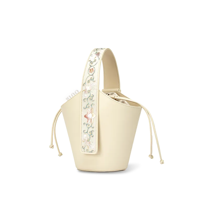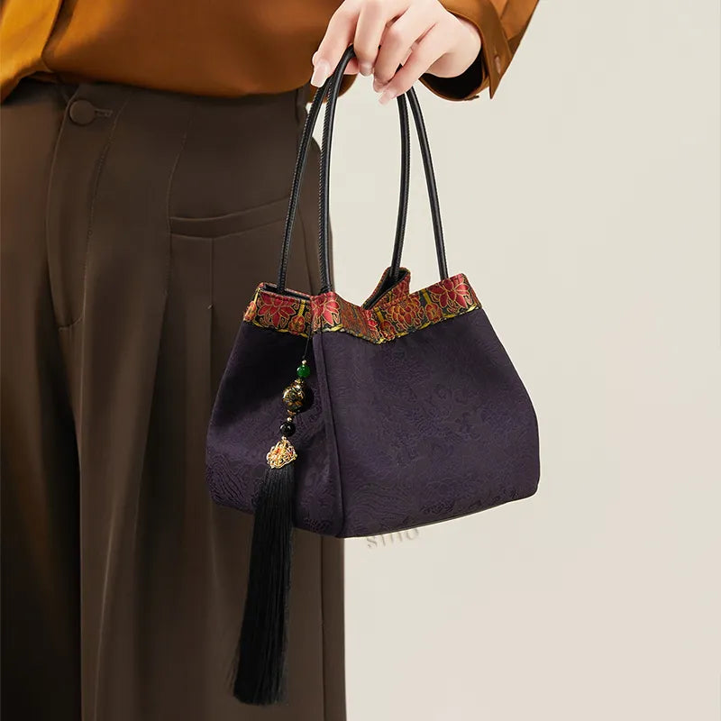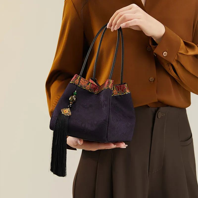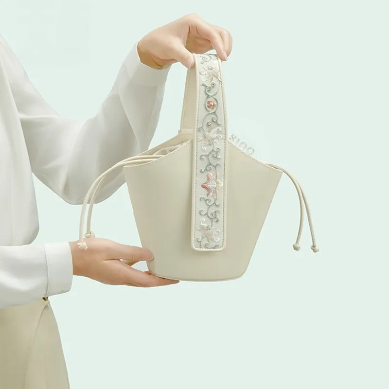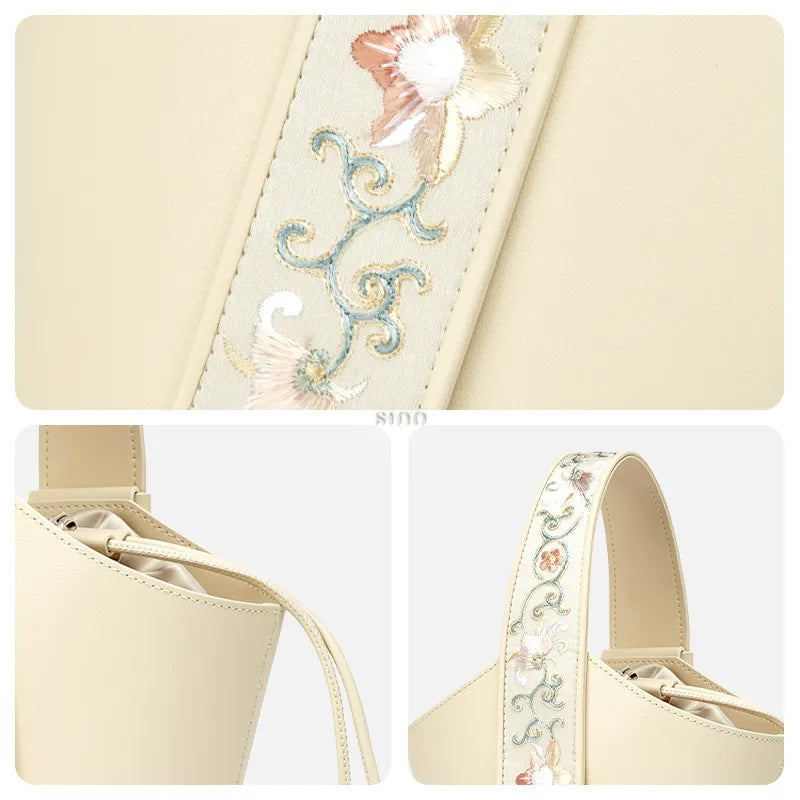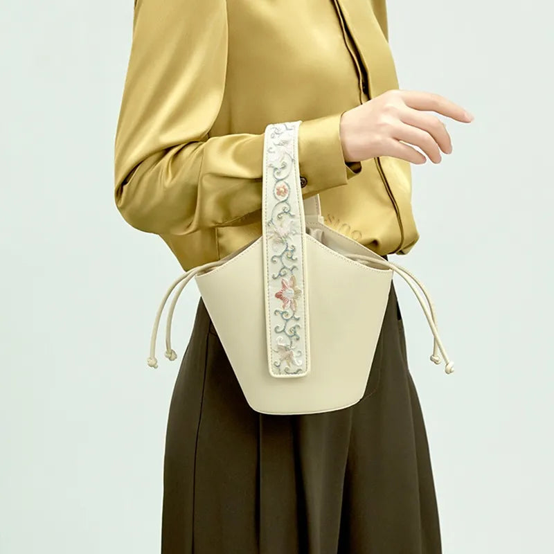 Chinoiserie Luxury Embroidery Lotus Scroll Pattern Drawstring Bucket Bag