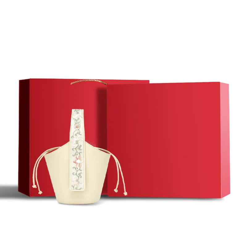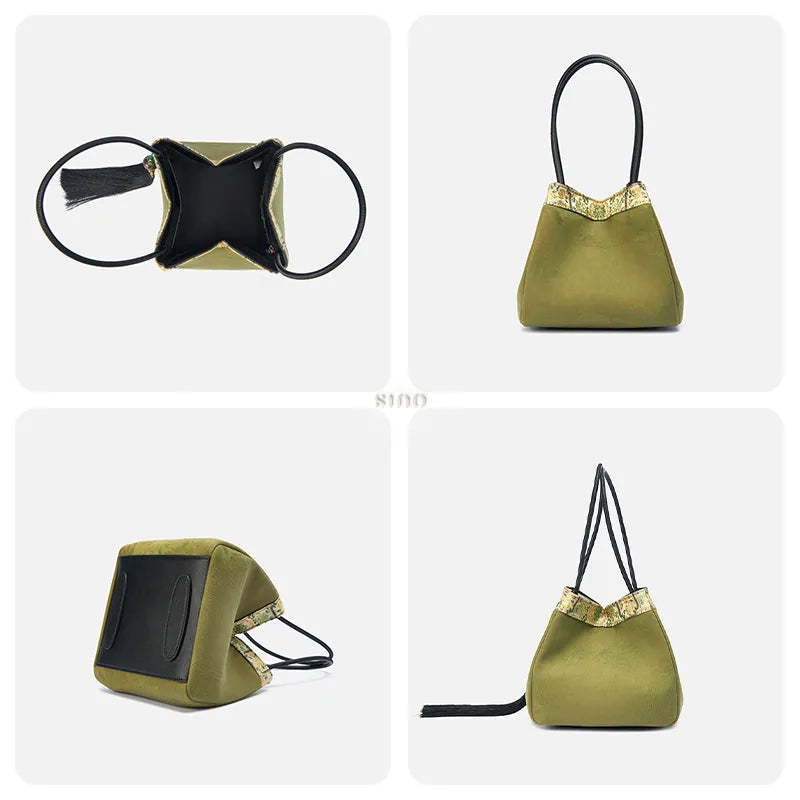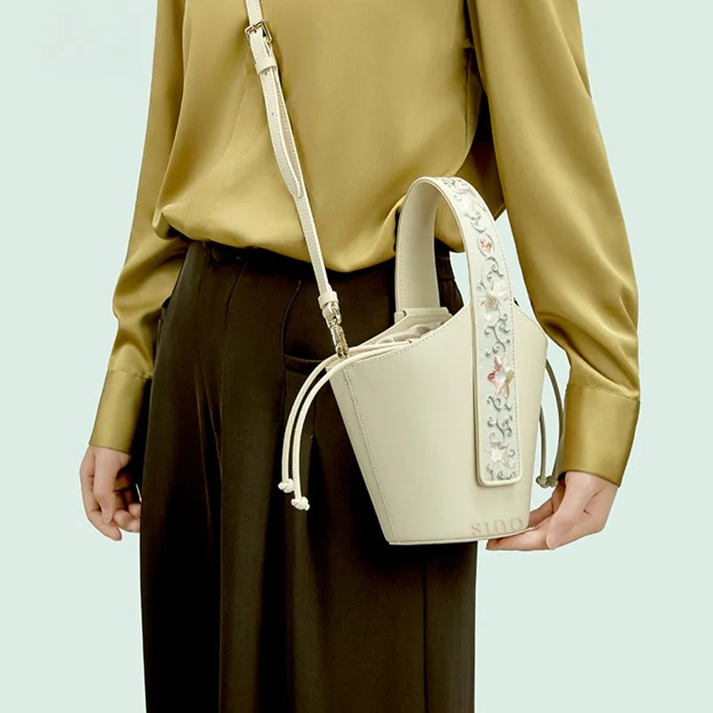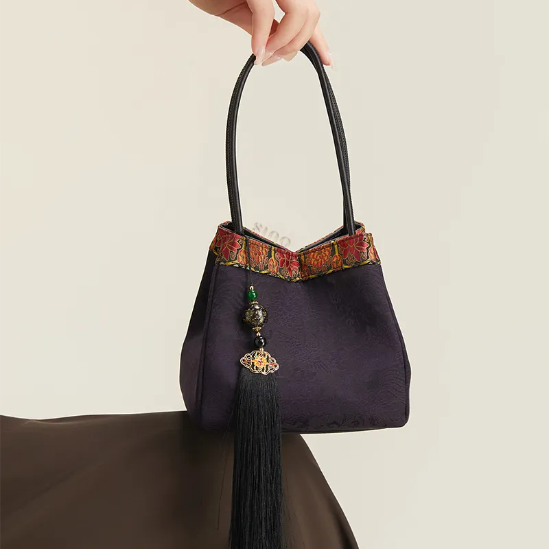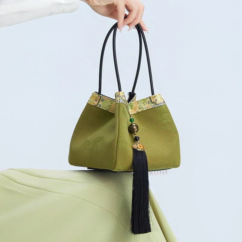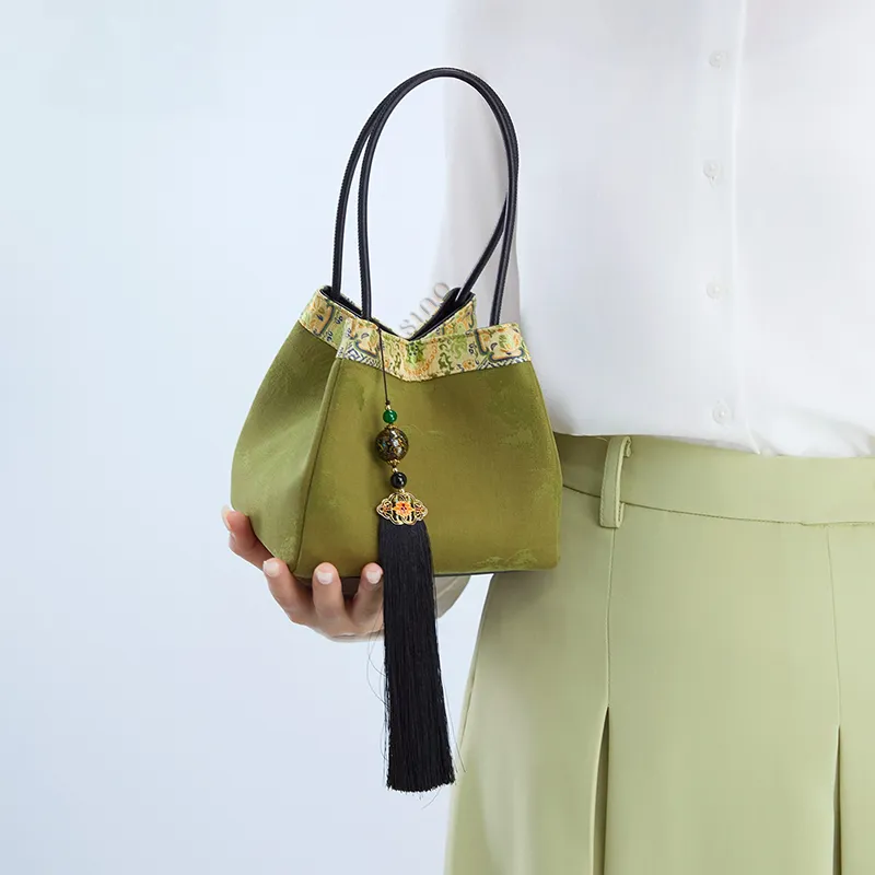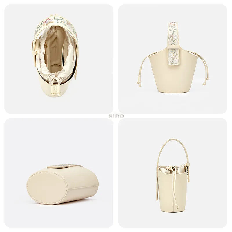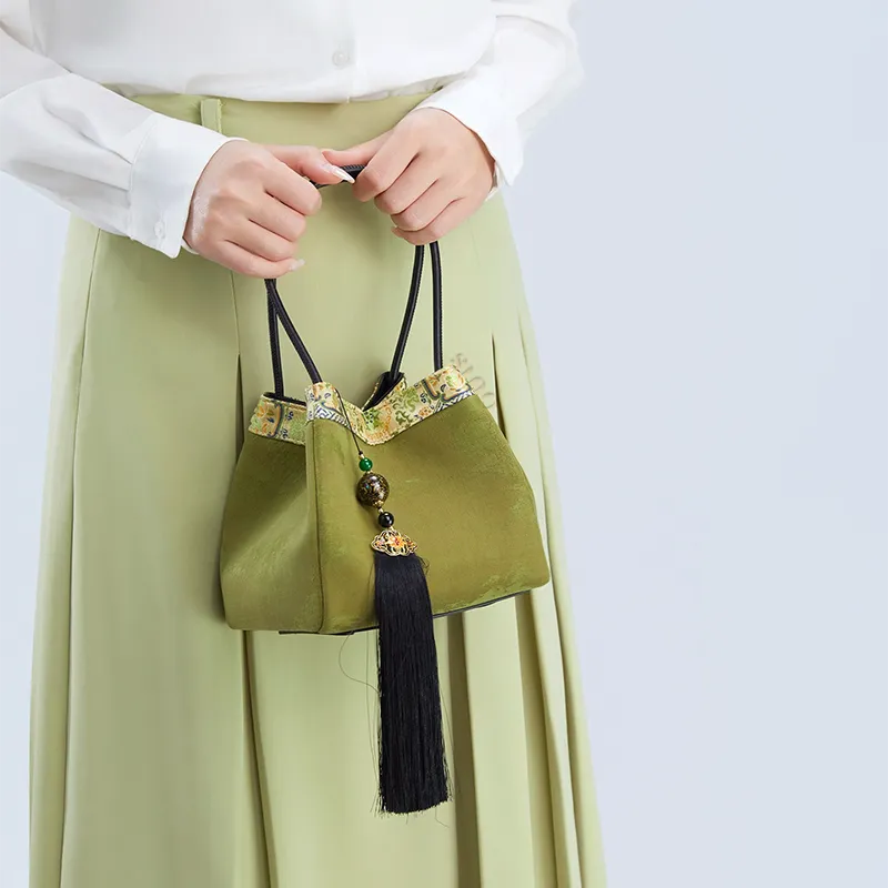 Chinoiserie Luxury Embroidery Lotus Scroll Pattern Drawstring Bucket Bag