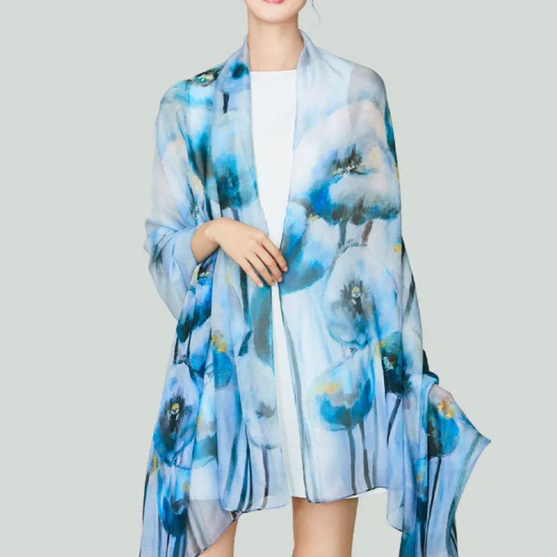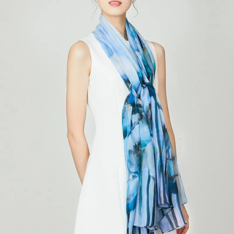 100% Mulberry Silk Long Scarf Shawl with Watercolor Floral Design 190 × 106 cm