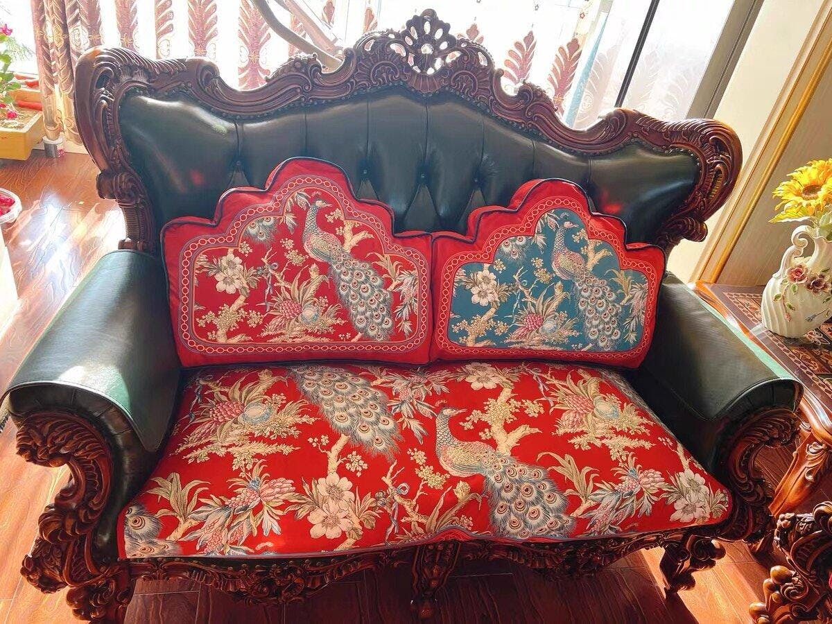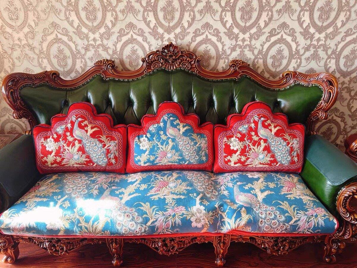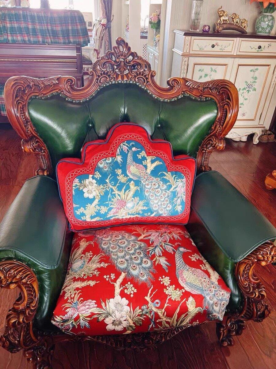 Coussin lombaire de luxe motif paon rouge festif chinoiserie