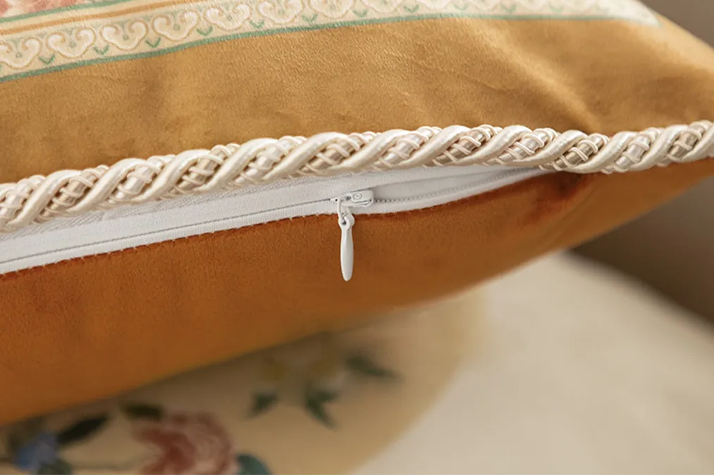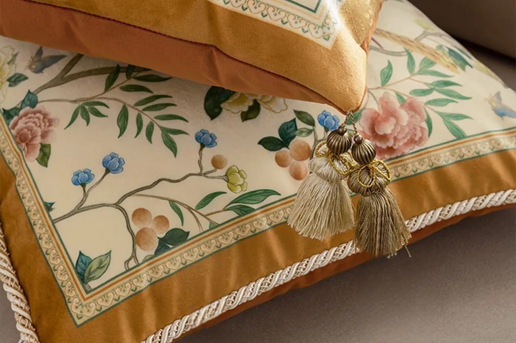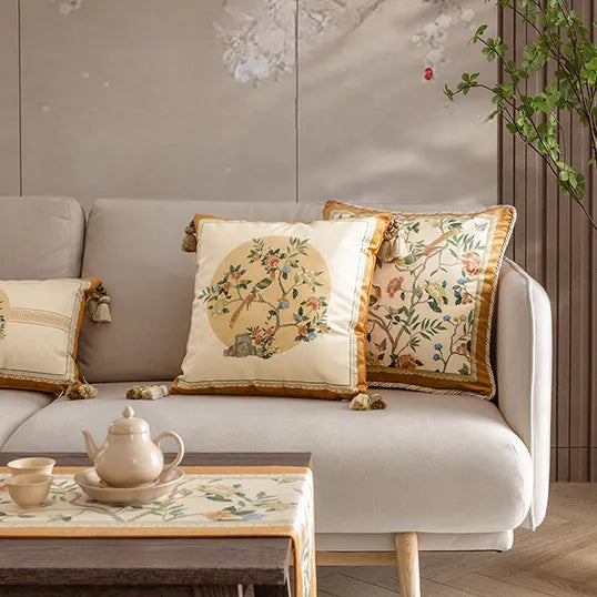 Coussin décoratif jaune à motifs de fleurs et d'oiseaux chinoiserie originaux