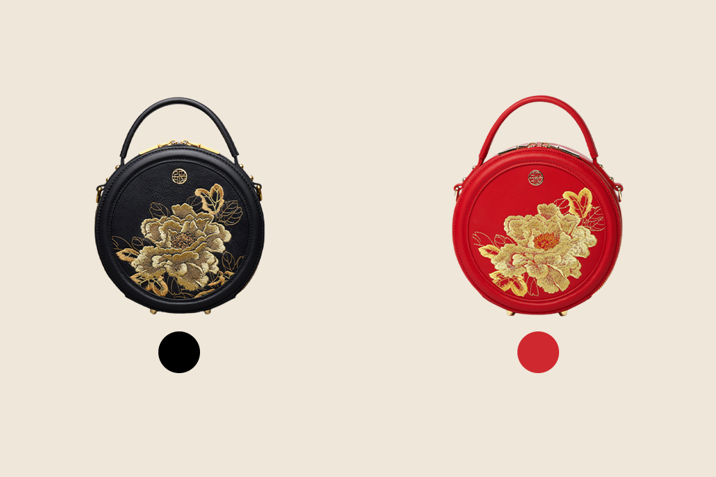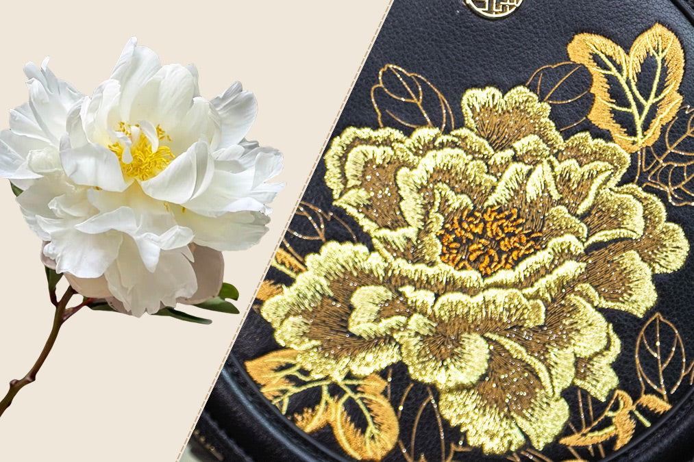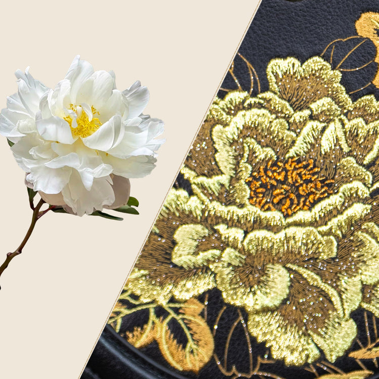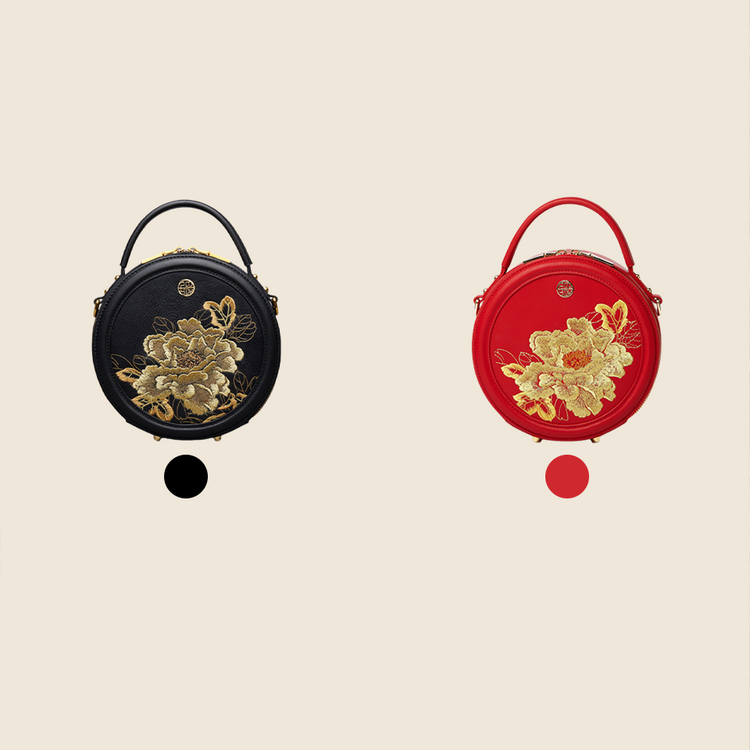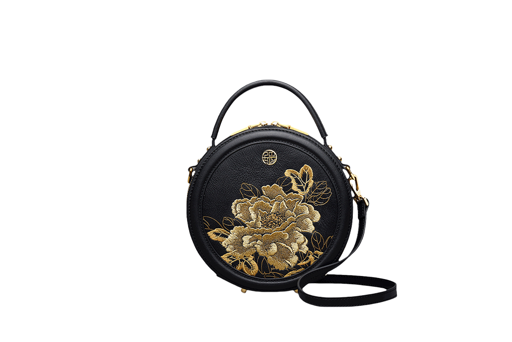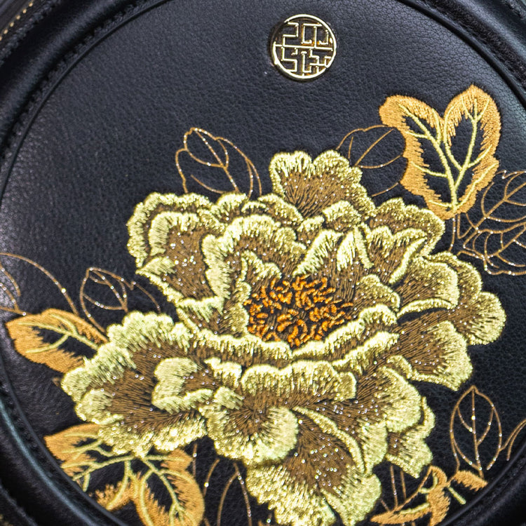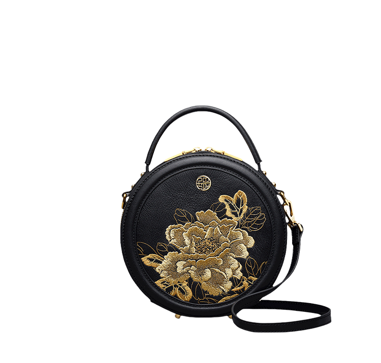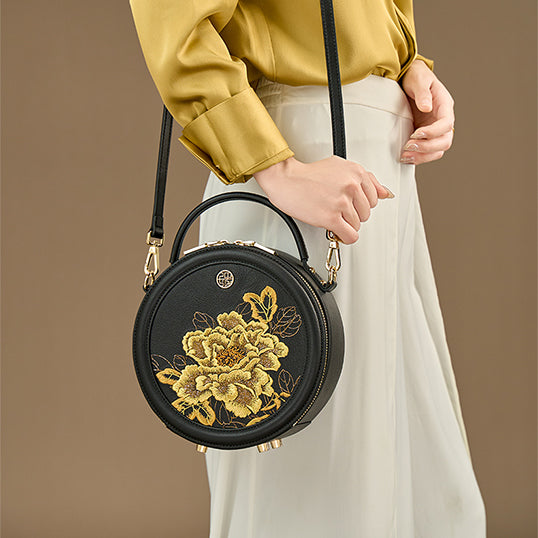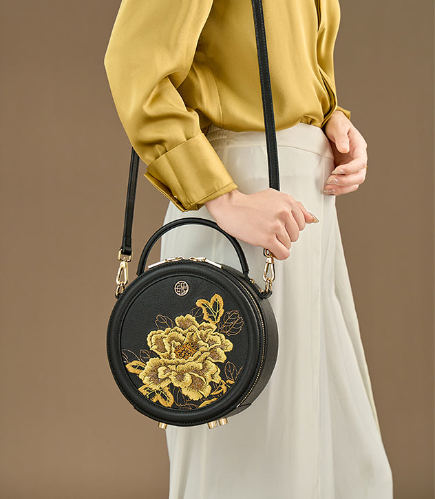 Sac à main rond en cuir brodé de luxe, motif pivoine royale dorée